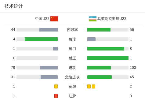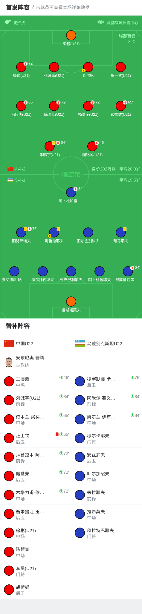 北京时间11月18日中国之队熊猫杯国际足球邀请赛 成都邀请赛 第3轮,中国U22对阵乌兹别克斯坦U22。上半场蒯纪闻屡次造险,下半场汪士钦报复推人被红牌罚下,列杰巴利耶夫中框。最终比分中国U22 0-0 乌兹别克斯坦U22。